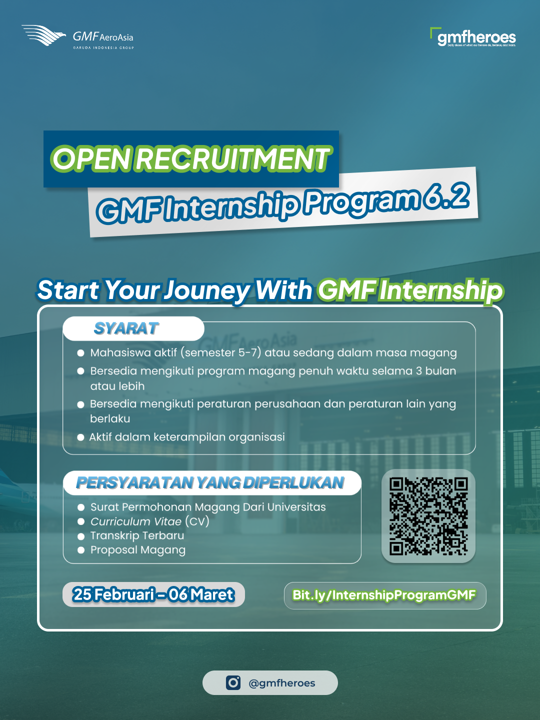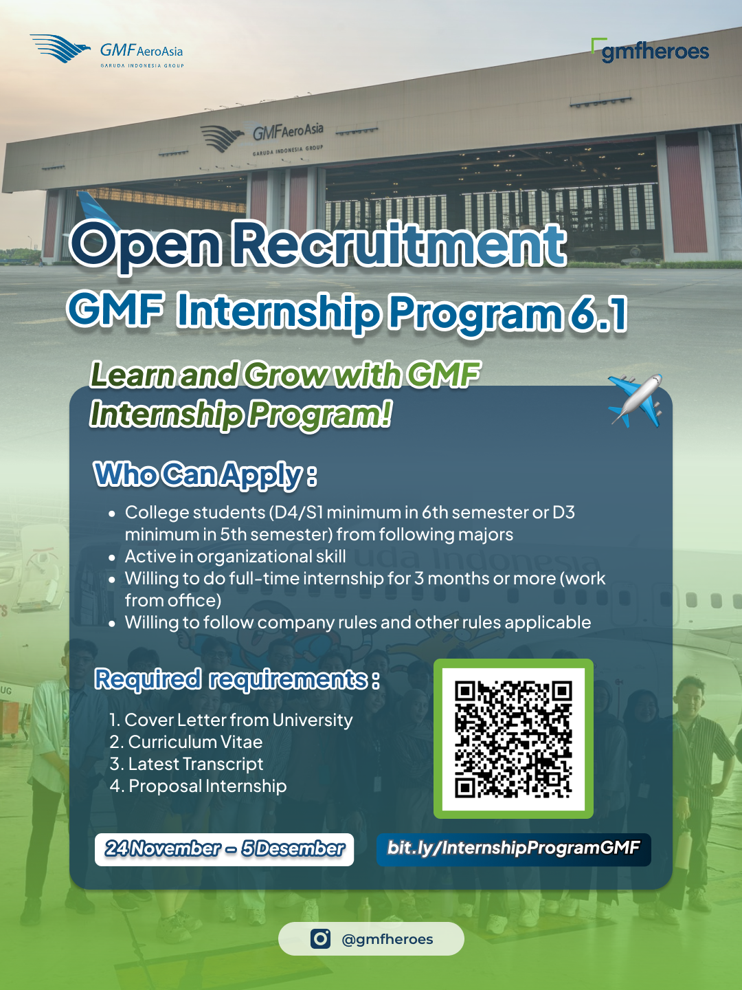 As part of GMF’s commitment to developing Indonesia’s young talent, our internship program offers college students the opportunity to work alongside experienced professionals, enhance their skills, and gain valuable qualifications. This program allows you to put into practice the knowledge acquired at university while experiencing firsthand the professional working environment at GMF.